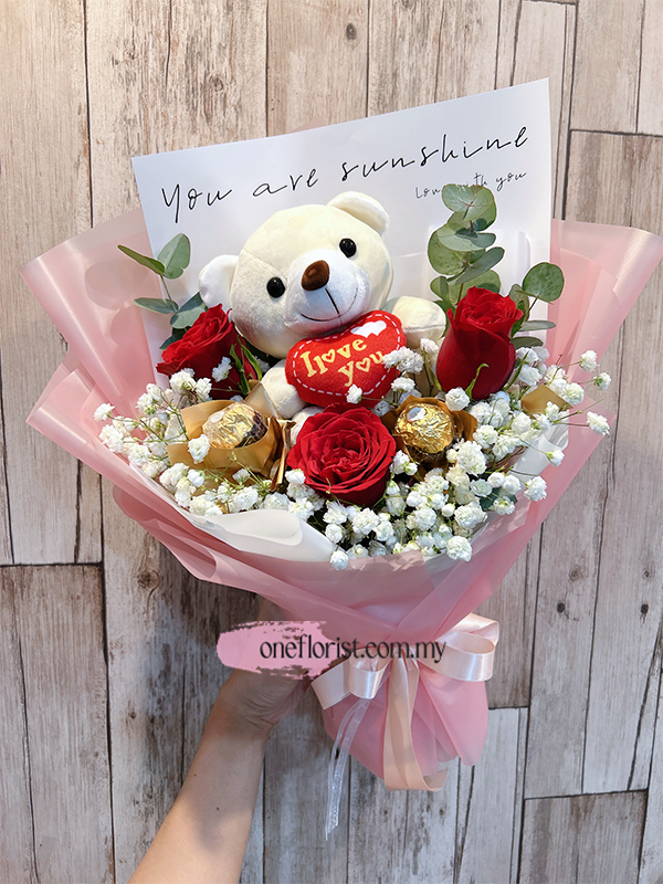 3 red rose bouquet , 15cm teddy bear, 2 rocher